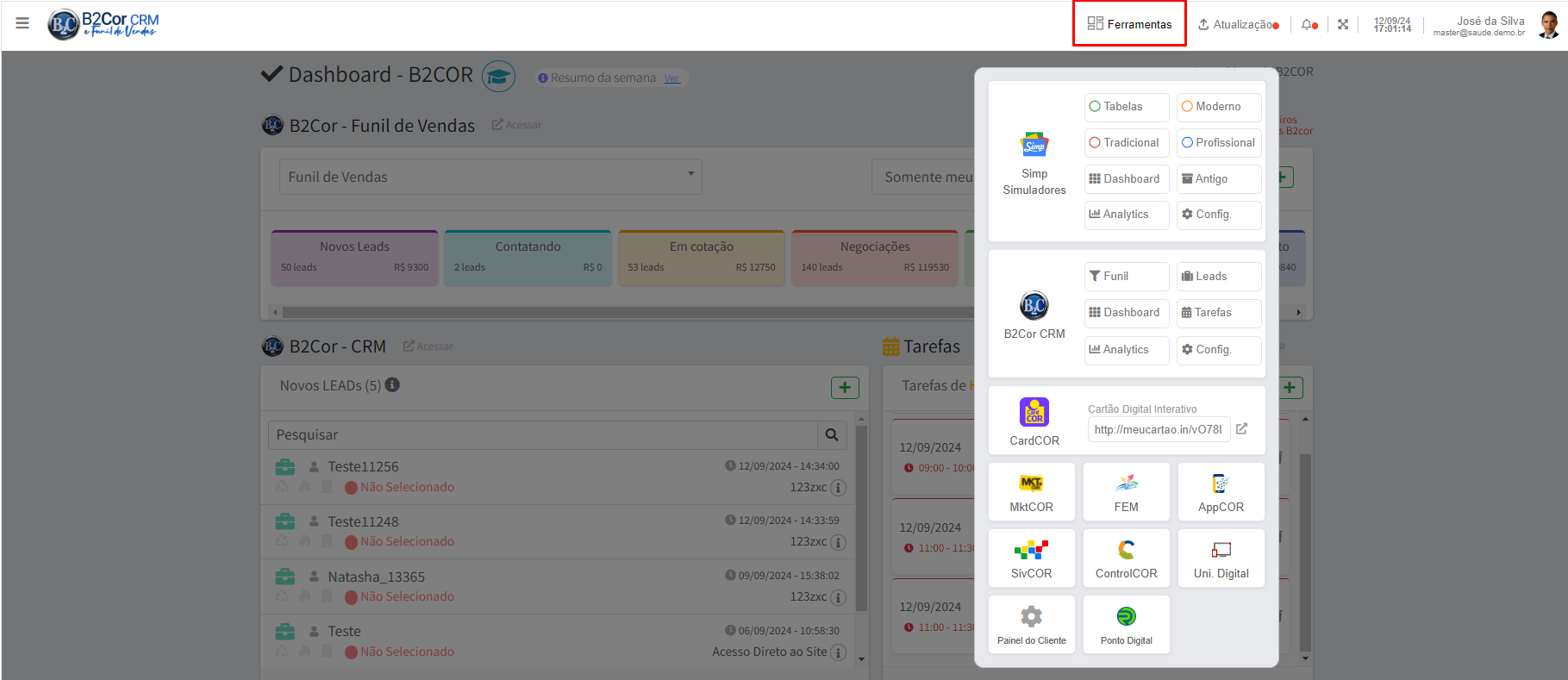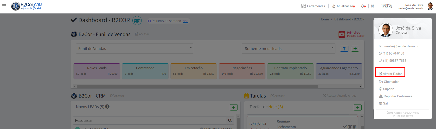 Ao clicar sobre seu nome, você consegue visualizar seus dados básicos (foto, nome, cargo, e-mail, entre outros), que são importantíssimos para diversas funcionalidades das suas ferramentas, pois são eles que irão aparecer no envio de cotações, no seu cartão digital e em diversas outras áreas.