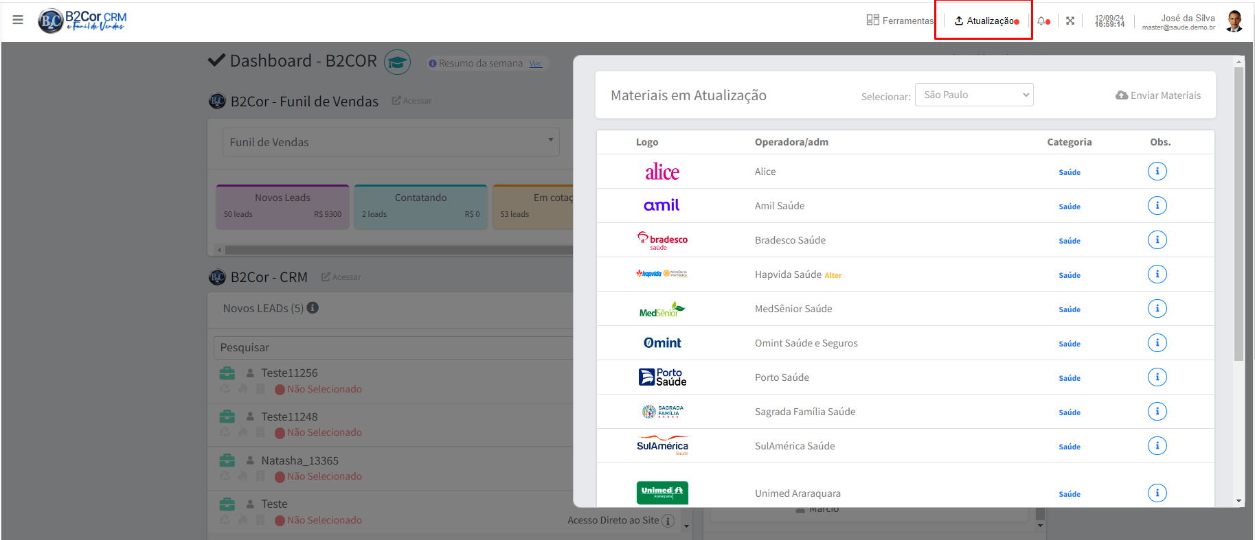 Ao clicar em “Atualização”, você visualiza quais são as tabelas que estão em processo de atualização e a previsão para que as mudanças estejam no ar no SIMP Simuladores: