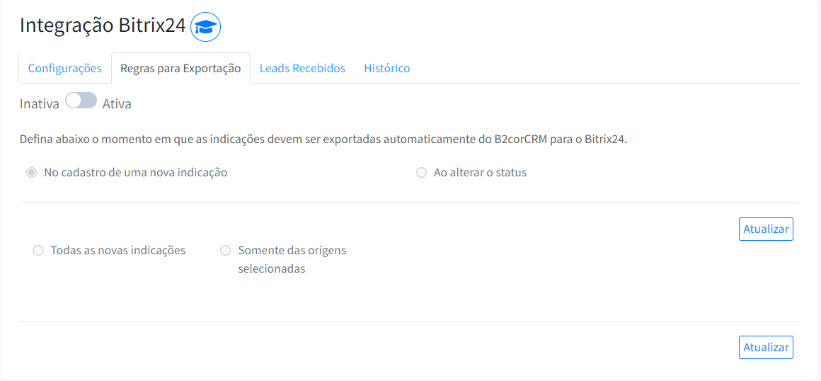 Se desejar enviar leads do B2COR CRM para o Bitrix24, você pode configurar nesta seção se deseja enviar todos os leads ou apenas alguns específicos.
