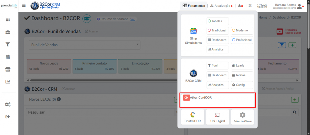 Na BARRA MULTITAREFAS, clique na opção Ferramentas e, em seguida, em ATIVAR CARDCOR.