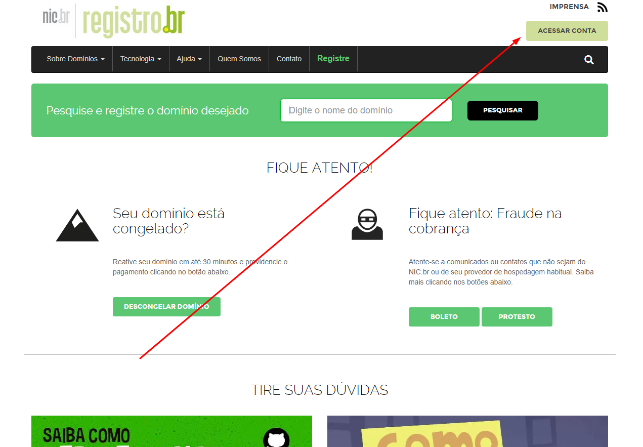 Ao entrar no site registro.br, no canto superior direito, clique em ACESSAR CONTA: