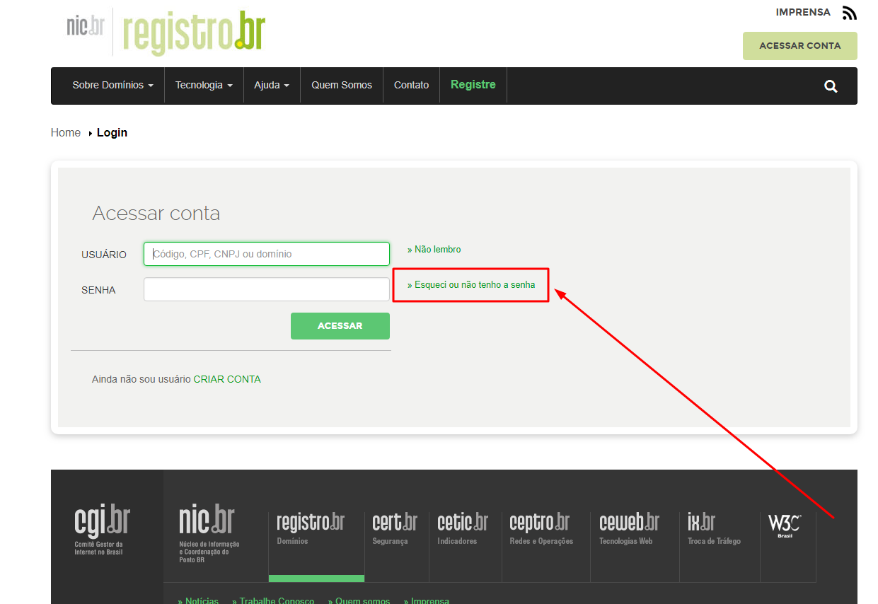 Para recuperar a sua senha no site registro.br, basta seguir os passos abaixo:
