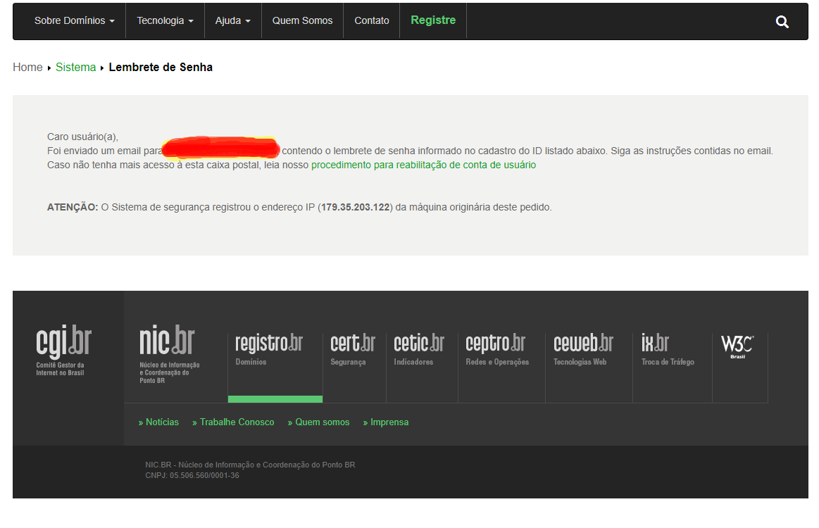 Automaticamente, o registro.br mandará um e-mail para você e mostrará um aviso como este, demonstrado no print acima, informando para qual e-mail que você registrou no sistema o lembrete da senha foi enviado.