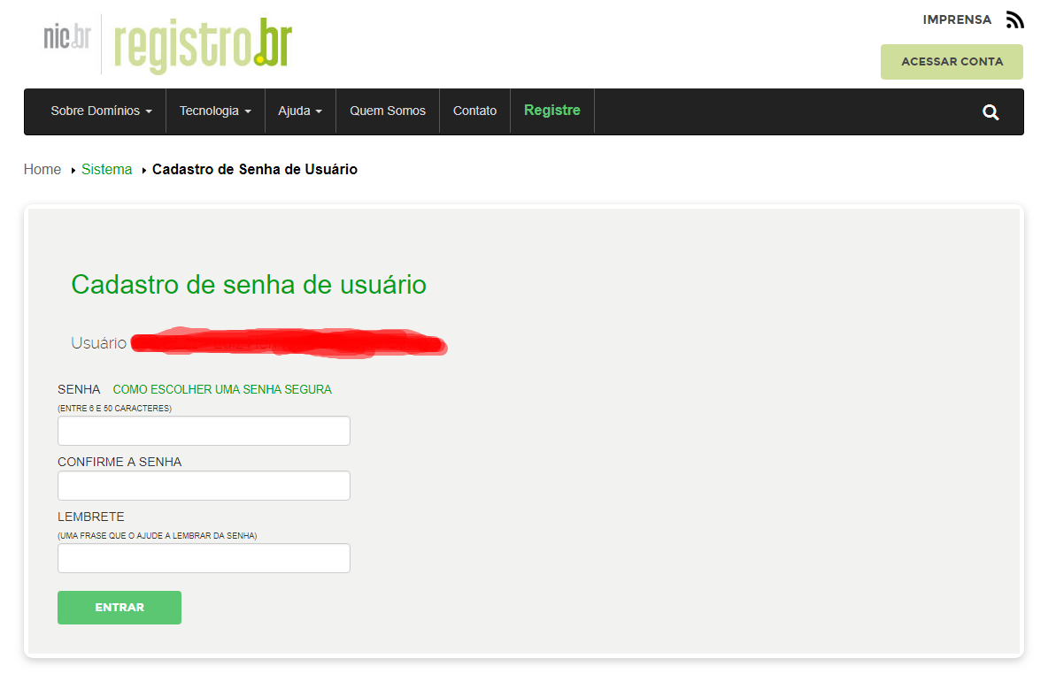 Ao clicar no link, você será direcionado para o registro.br novamente. Insira sua nova senha e depois confirme a senha, além de colocar um lembrete para que você possa recordar dela com mais facilidade da próxima vez.